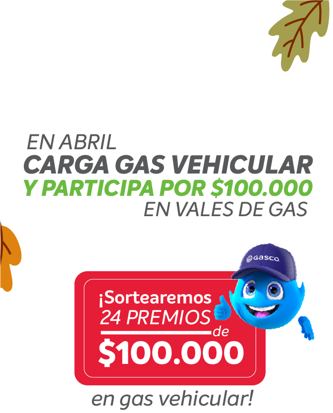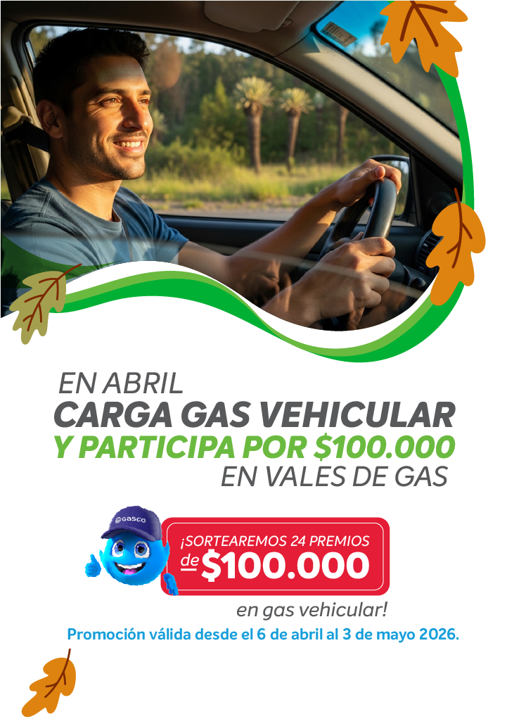 Concurso vigente desde el lunes 6 de abril al domingo 3 de mayo 2026, válido solo para clientes que carguen gas vehicular en estaciones GASCO AUTOGAS adheridas. Considera 24 premios de "$100.000 en vales de Gas Vehicular”, 1 premio por cada estación. Los sorteos se realizarán entre el 4 y el 8 de mayo y los ganadores serán contactados al teléfono o mail registrados en el formulario. Bases legales disponibles en